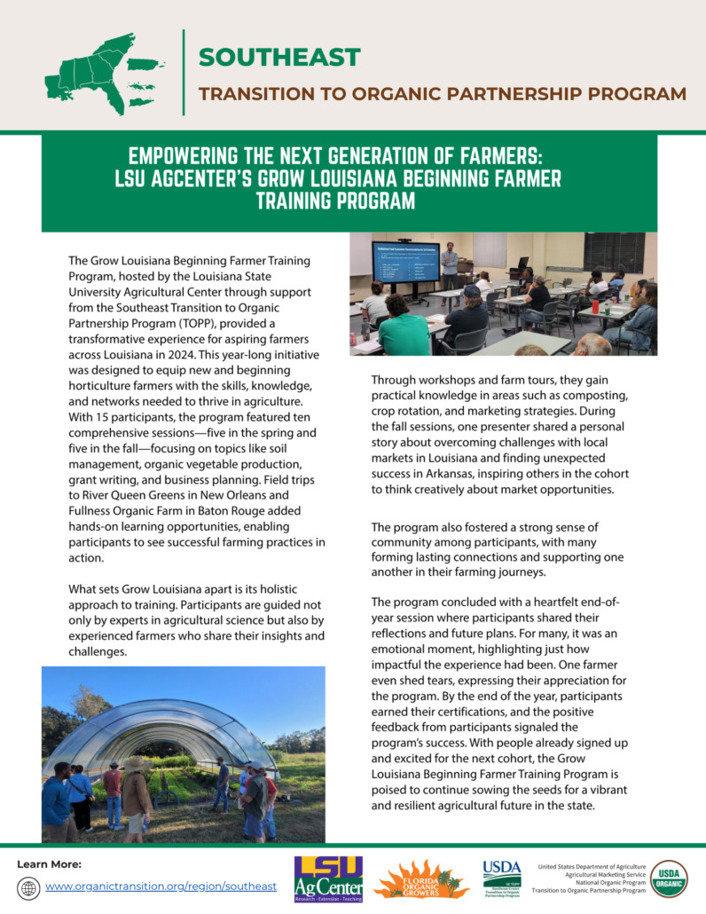 In September, Southeast TOPP representatives from across the region came together for the second SE TOPP Partner Annual meeting in Gulfport, Mississippi. Over two days, partners shared impacts, successes and challenges over the past year, and participated in dynamic workshops on measuring impact and exploring the “why’s and why not’s” of organic certification. Additionally, in preparation for Year 3 activities, partners engaged in planning sessions focused on increasing organic acreage and providing sustained support for farmers during the transition process. A standout moment was the farm tour and farm-to-table lunch at Galloway Family Farm and Education Center, where attendees witnessed first-hand the dedication of farmers and the value of building strong local food systems. The farmer panel that followed offered different perspectives on the transition process and organic certification. Another highlight of the meeting was the keynote speech delivered by Dr. Jenny Tucker, Deputy Administrator of the USDA Agricultural Marketing Service National Organic Program. Dr. Tucker’s insights on the TOPP program’s national goals and its alignment with regional efforts inspired partners to continue the momentum into the coming year.